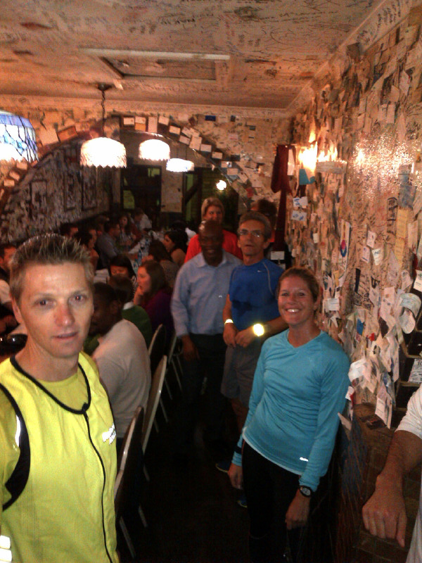 I met the 6 other runners at Nambitha in Vilakazi street Soweto and the wonderful experience began. As we got out of the car a local ran up to us, extended a hand and proceeded to sing us a song he had put together. Shortly after that a very excited mother came running up to us, literally screaming with joy, “White people! White people! Hello, white people!” Again it was hand shakes and hugs and smiles, like we had come across a long lost friend. In the next moment she was shouting across the road, calling her child (who was on her husband’s shoulders) to come and see the white people. This young child, I would guess around 4 or 5 years old, had never seen a white person in his life. He stared at us as though we had just landed in a space ship from some remote planet (then again, looking back at the photo’s I’m not surprised, most of us where wearing tights with some very bright reflective clothing and two members of our group even had headlamps on like we were going mining or something.)